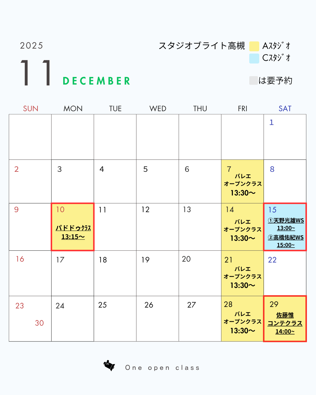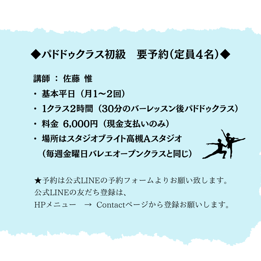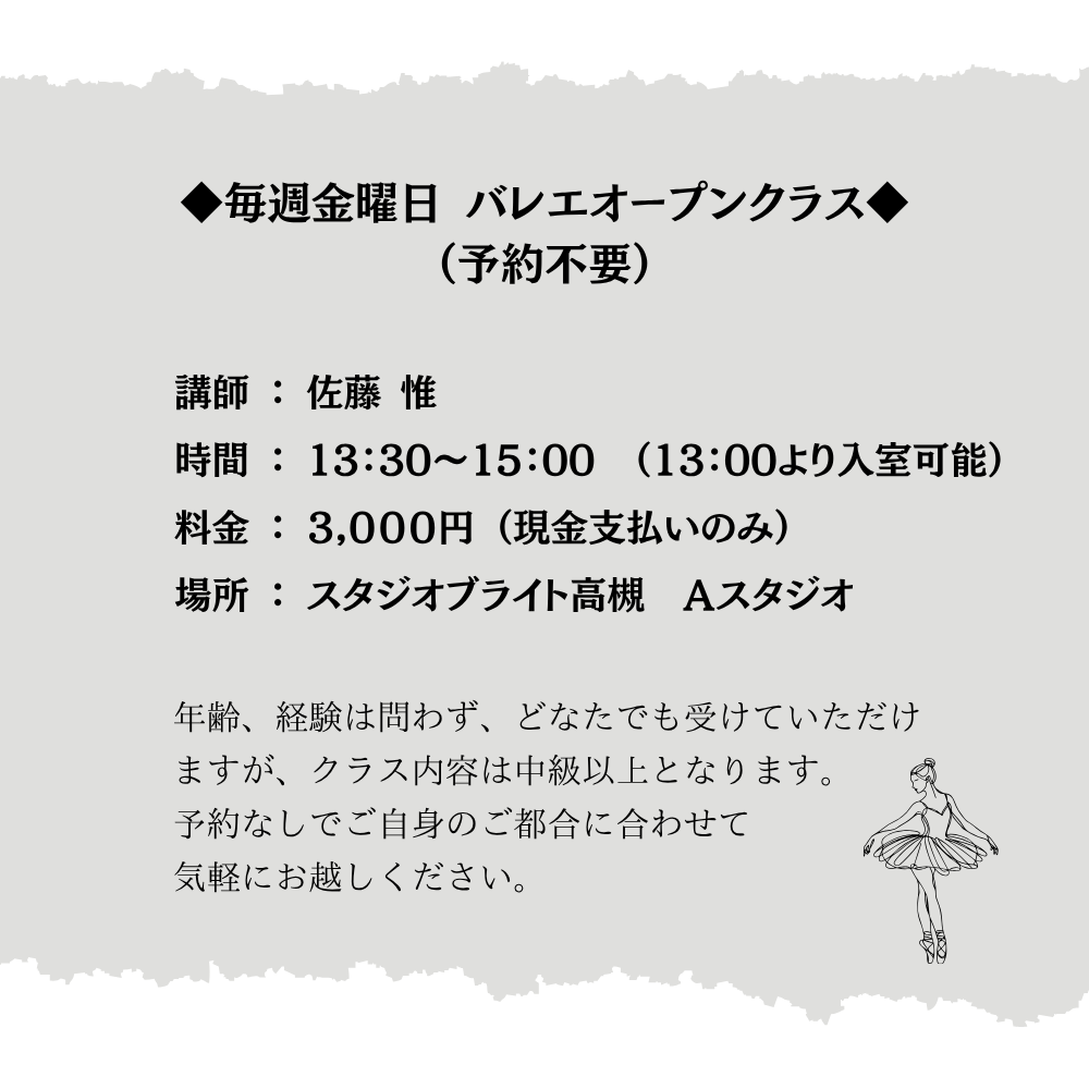 毎週金曜日バレエオープンクラスだけではなく、不定期でパドドゥクラスを月1〜2回開催。またゲスト講師によるJAZZのワークショップも主催している。他ジャンルのダンサーたちが色んなダンスに挑戦し、繋がれる場をつくっていきたい。